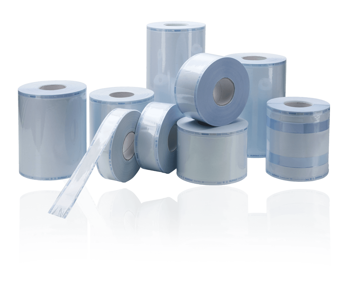 Eurosteril Sterilisationsfolie ist als Rollenware bis 30 cm Breite erhältlich in flacher Ausführung oder mit Falte für sperriges Material. Der Längenzuschnitt erfolgt individuell. Zur Kontrolle ist ein Kontrastanzeiger integriert. Er zeigt an, ob eine Sterilisationsbehandlung mit Dampf stattgefunden hat.
