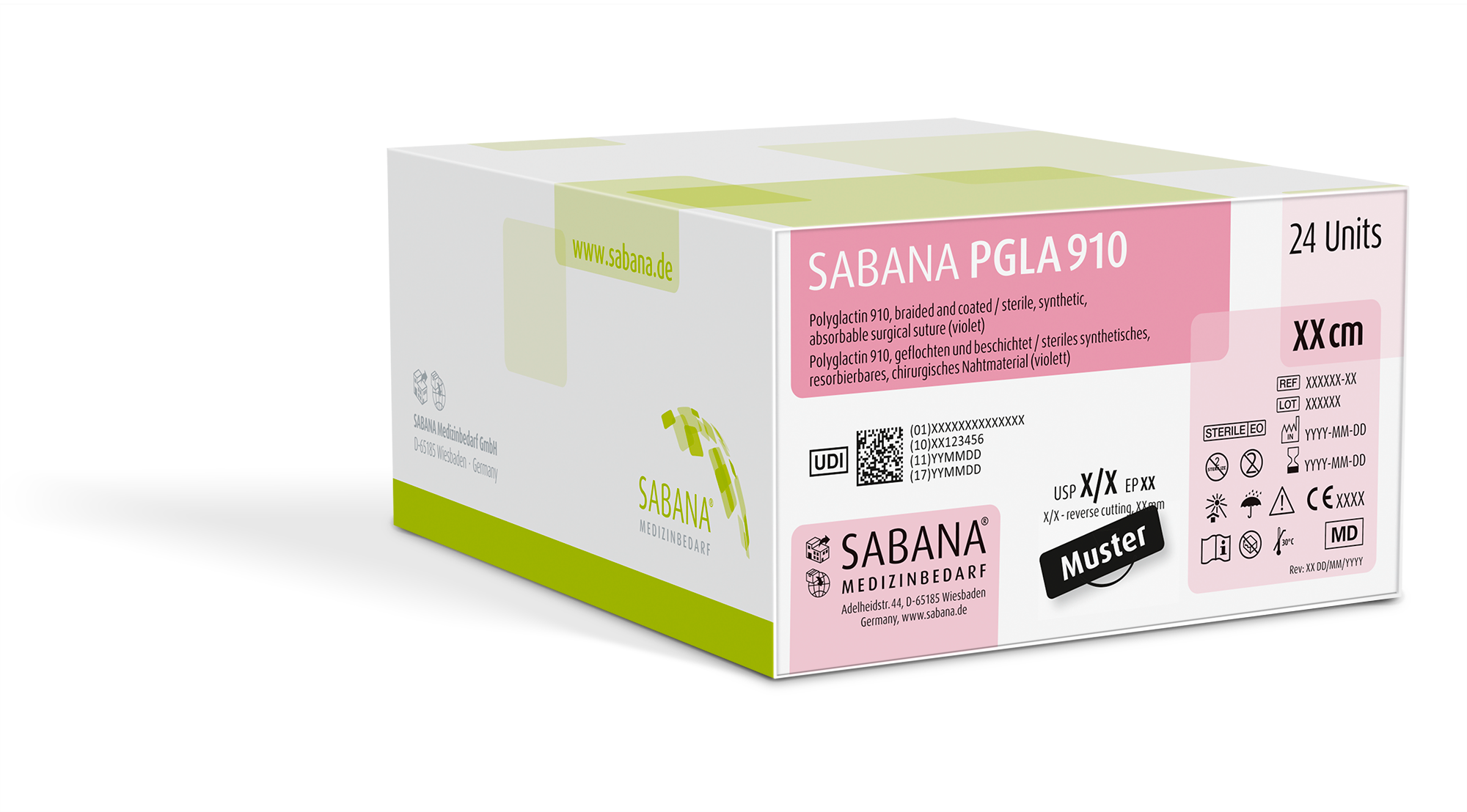 SABANA PGLA 910 (Polyglactin 910) ist ein steriles, synthetisches, multifiles, geflochtenes, resorbierbares chirurgisches Nahtmaterial, das aus einem Co-Polymer aus 90 % Glycolid und 10 % L-Lactid hergestellt wird. SABANA PGLA 910 ist mit einer Mischung aus dem Co-Polymer Polyglactin 370 (30 % Glycolid und 70 % Lactid) und Calciumstearat beschichtet.