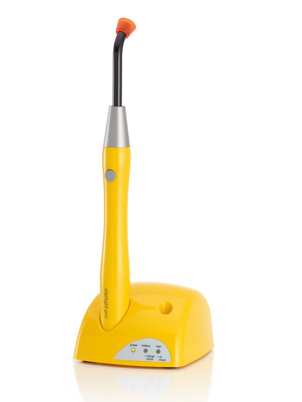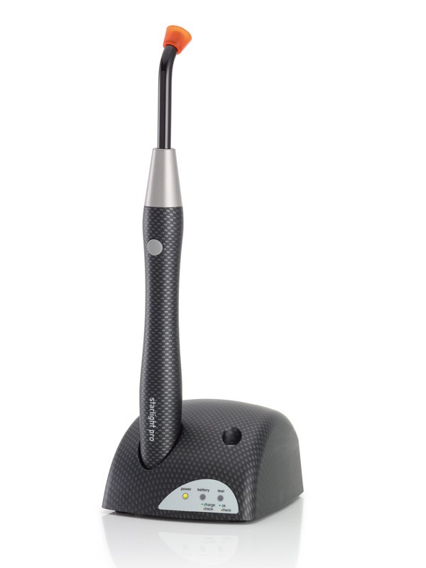 Die schnurlose LED Polymerisationslampe für den flexiblen Einsatz von Zimmer zu Zimmer. Der leistungsstarke und langlebige Lithium-Ionen-Akku erlaubt 320 Zyklen à 10 sec in Folge, der Ladevorgang dauert nur 120 min. Mit dem eingebauten Radiometer kann die Leistung kontrolliert werden. starlight pro härtet eine 2 mm Schicht in nur 10 sec absolut zuverlässig aus und ist mit 105 g ultraleicht. Wählbar sind die Modi „Fast-Curing” und „Slow Rise” (Softstart).