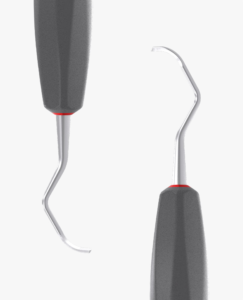 Die Ergonomie und Effizienz des metallischen Arbeitsteils ermöglicht eine kontrollierte und sichere Führung und mindert die Ermüdung der Muskulatur von Hand und Handgelenk. Die Universalküretten haben eine abgerundete Klinge und zwei Schneidflächen zur Entfernung von mittelstarkem bis starkem Zahnstein von allen supra- und subgingivalen Zahnoberflächen.