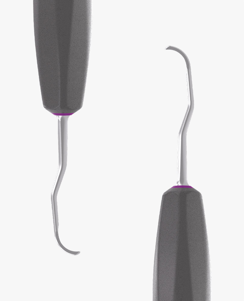 Die Ergonomie und Effizienz des metallischen Arbeitsteils ermöglicht eine kontrollierte und sichere Führung und mindert die Ermüdung der Muskulatur von Hand und Handgelenk. Die Universalküretten haben eine abgerundete Klinge und zwei Schneidflächen zur Entfernung von mittelstarkem bis starkem Zahnstein von allen supra- und subgingivalen Zahnoberflächen.