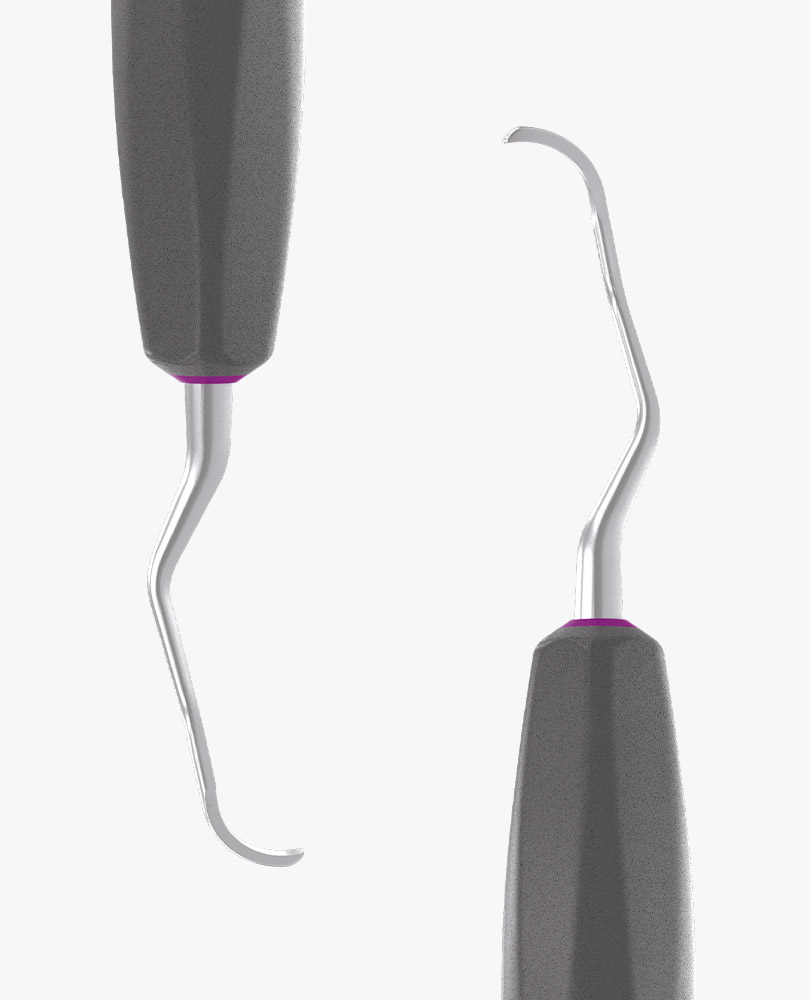 Die Ergonomie und Effizienz des metallischen Arbeitsteils ermöglicht eine kontrollierte und sichere Führung und mindert die Ermüdung der Muskulatur von Hand und Handgelenk. Die Universalküretten haben eine abgerundete Klinge und zwei Schneidflächen zur Entfernung von mittelstarkem bis starkem Zahnstein von allen supra- und subgingivalen Zahnoberflächen.
