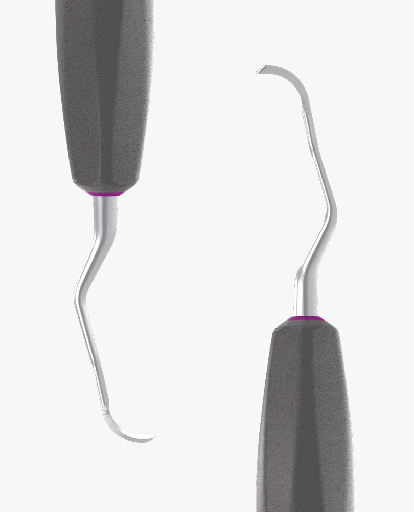 Die Ergonomie und Effizienz des metallischen Arbeitsteils ermöglicht eine kontrollierte und sichere Führung und mindert die Ermüdung der Muskulatur von Hand und Handgelenk. Die Universalküretten haben eine abgerundete Klinge und zwei Schneidflächen zur Entfernung von mittelstarkem bis starkem Zahnstein von allen supra- und subgingivalen Zahnoberflächen.