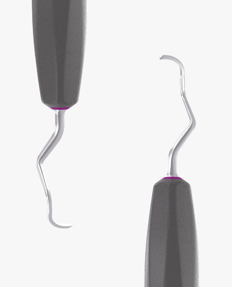 Die Ergonomie und Effizienz des metallischen Arbeitsteils ermöglicht eine kontrollierte und sichere Führung und mindert die Ermüdung der Muskulatur von Hand und Handgelenk. Die Universalküretten haben eine abgerundete Klinge und zwei Schneidflächen zur Entfernung von mittelstarkem bis starkem Zahnstein von allen supra- und subgingivalen Zahnoberflächen.