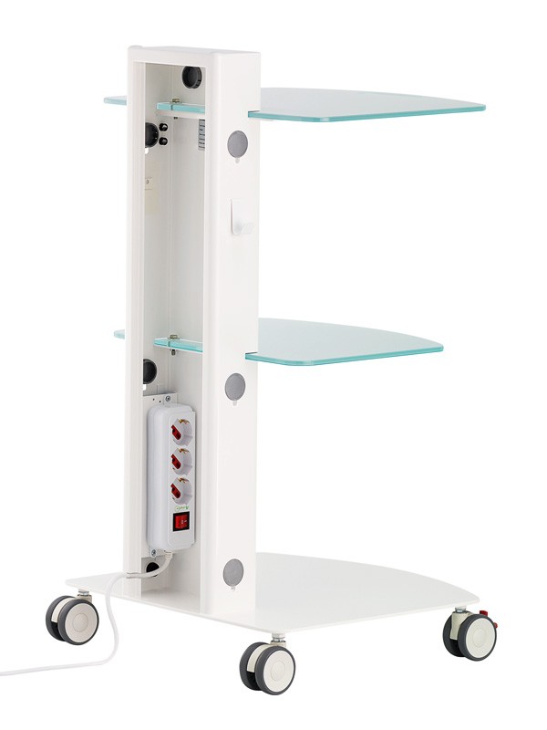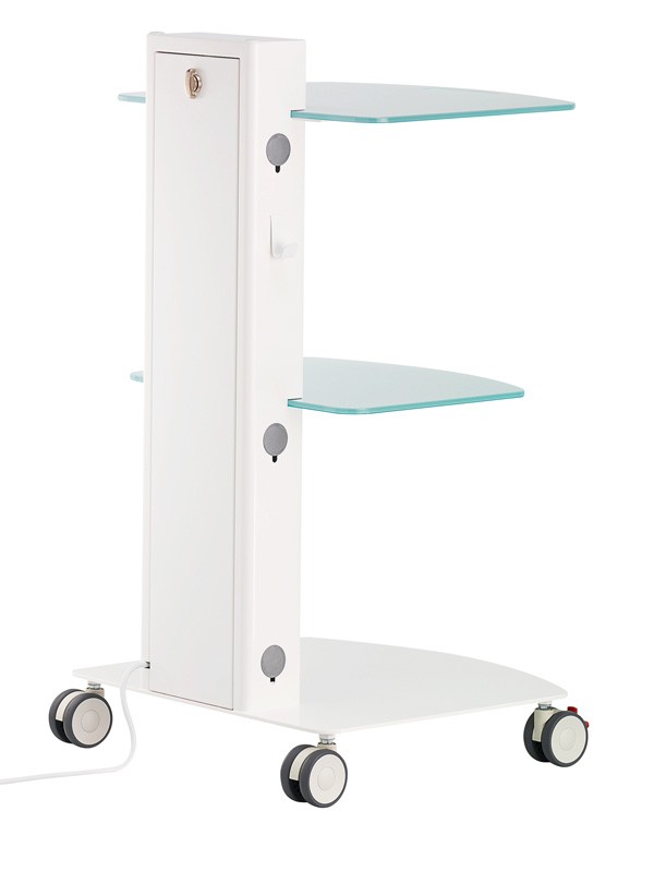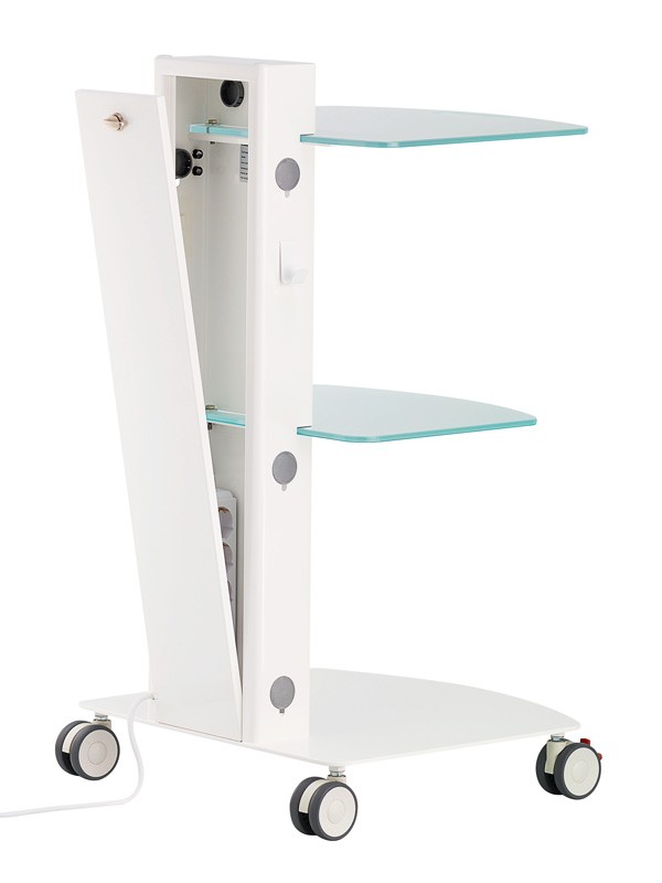 Das universal Cart gibt Tischgeräten ein Maximum an Mobilität. Der rückwärtig zugängliche, verdeckte Kabelkanal enthält eine Steckerleiste. Die Stromversorgung erfolgt über eine zentrale Leitung. Auf Höhe der Trays sind jeweils Öffnungen angebracht, die es ermöglichen Versorgungsleitungen durchzuführen.